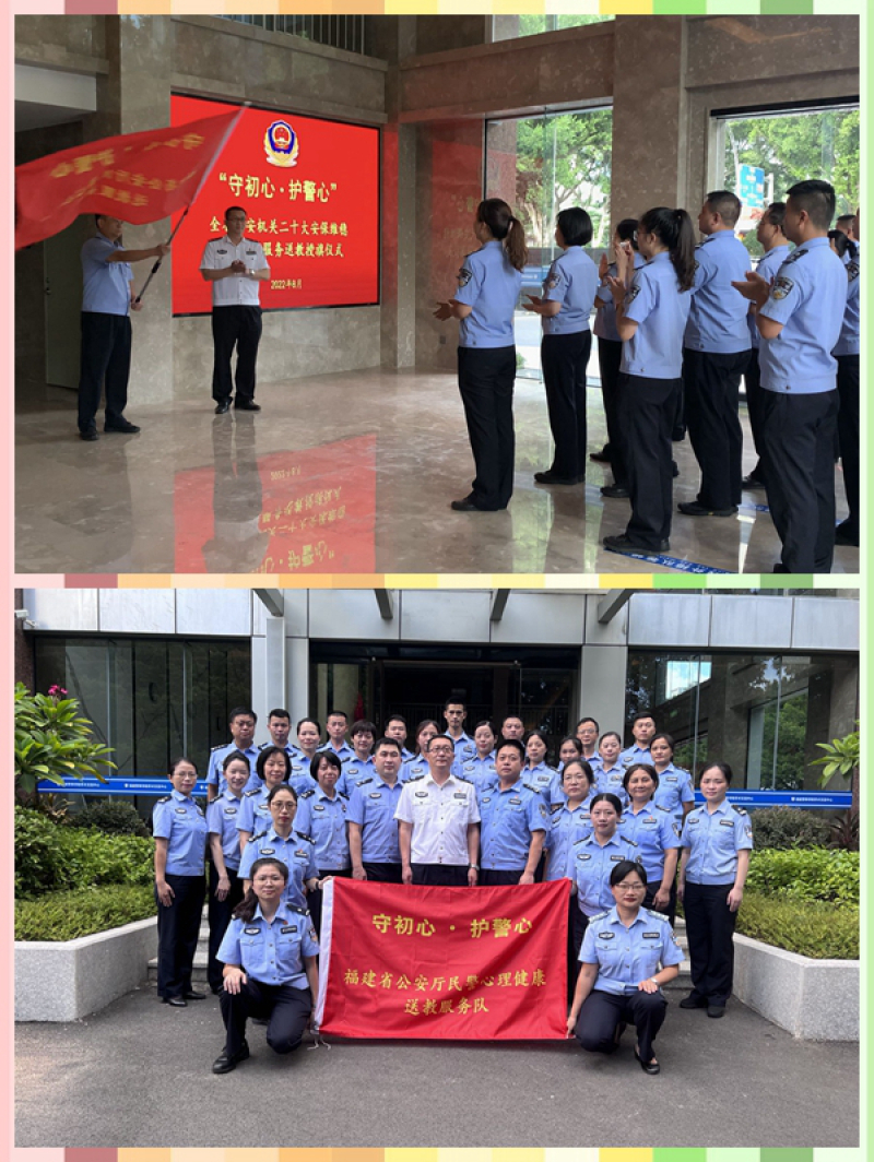 为深入贯彻公安部党委和省厅党委爱警暖警的部署要求,近日,省厅政治部启动“守初心·护警心——福建省公安厅民警心理健康服务送教”活动并举行授旗仪式。厅政治部副主任、人事处处长施玉安为送教服务队授旗并讲话。施副主任指出,开展心理健康服务送教活动是全省公安政治工作服务保障党的二十大安保维稳和夏季治安打击整治“百日行动”的一项重要措施。当前任务繁重,加之持续高温,广大民警辅警长时间高负荷工作,身心压力大,此时开展心理送教,有助于为广大民警辅警舒缓压力,很有意义、十分必要。施副主任要求,送教服务队要聚焦重点、紧扣需求,积极投入备课,精心精细精准开展好这次送教活动,切实把厅党委关心关爱传送到基层一线,激励全省广大民警辅警以更加昂扬的斗志和饱满的热情投入党的二十大安保维稳工作。