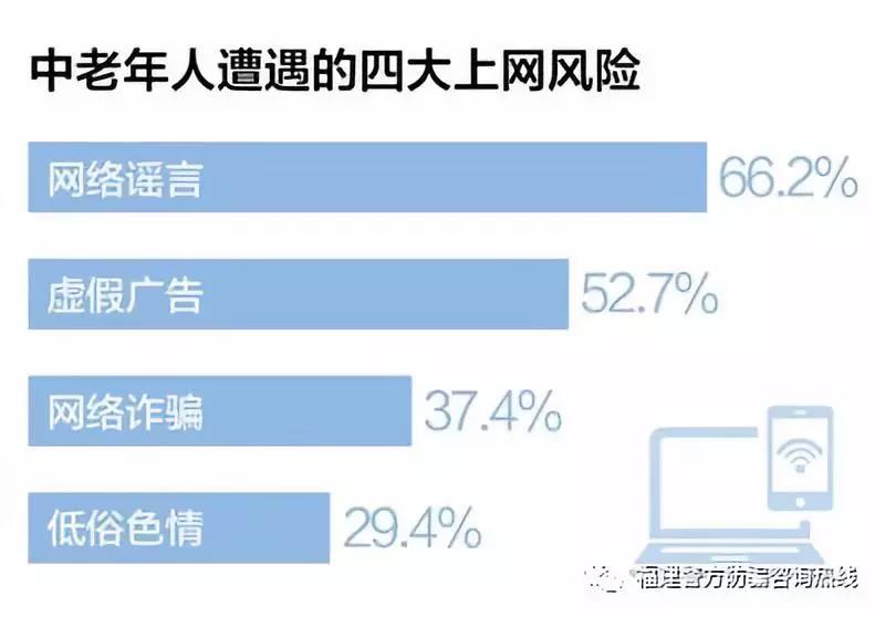 《报告》指出,网络谣言、虚假广告、网络诈骗和低俗色情已成为中老年人遭遇的四大上网风险。以网络诈骗为例,保健品诈骗、红包诈骗、彩票中奖诈骗已成为中老年网民最易遭遇的网络诈骗类型,而三线城市的中老年网民遭遇网络诈骗的比例最高。尽管有61.8%的“银发族”比较关注中老年人群上网引发的安全事件并吸取教训,但多数仍认为自己甄别网络风险能力一般。其中,中老年网民对网络传销和非法集资、假冒公检法等诈骗信息、涉及食药品网络谣言信息等风险表示“不了解”的比例均超过三成。